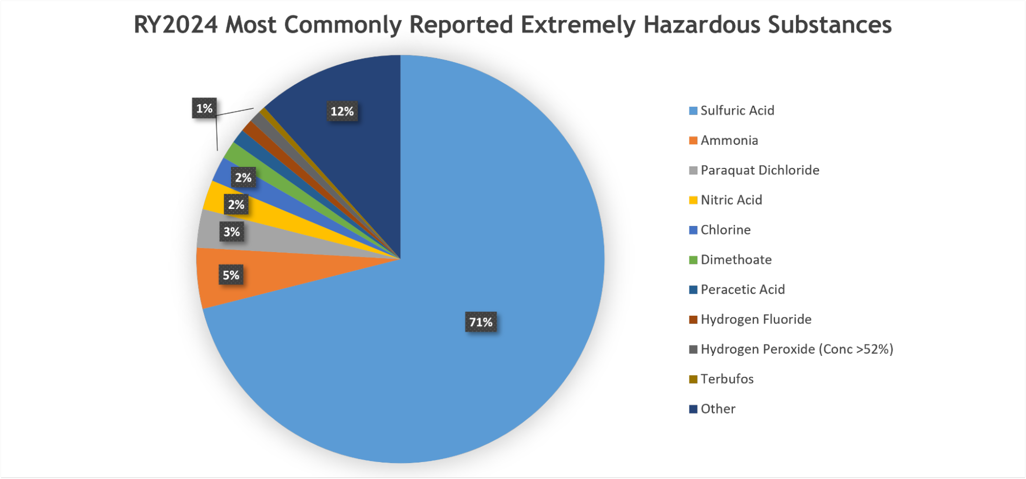 Sulfuric acid was the most common EHS for Reporting Year 2024, making up 71% of all EHSs reported in Colorado. The majority of facilities that filed reports for sulfuric acid linked its use to the storage of lead-acid batteries. Lead-acid batteries are the most prevalent type of commercially available rechargeable battery. These batteries use an electrolyte typically consisting of a mixture of sulfuric acid and water. Since sulfuric acid is an EHS, proper use and storage of lead-acid batteries are essential.