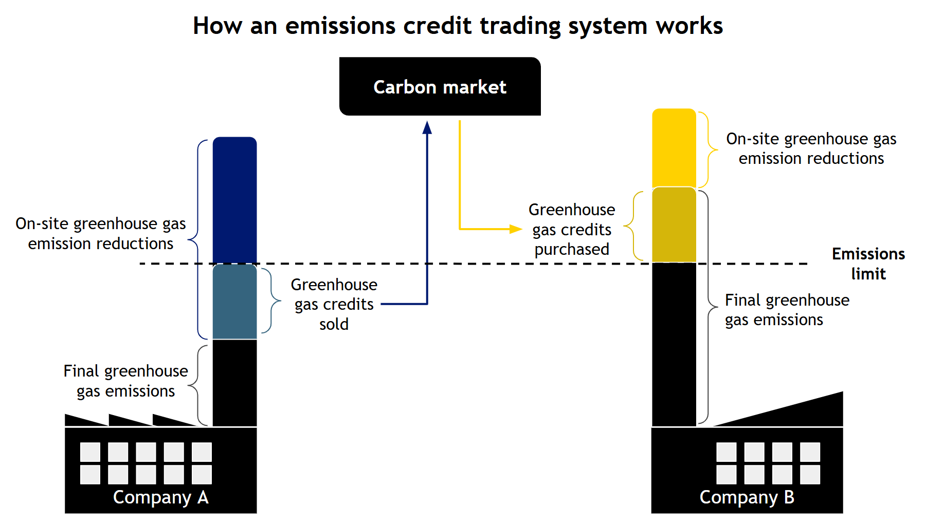 Companies can then sell credits earned to other companies in the sector. The companies buying credits are typically those that cannot fully achieve their emissions limits through onsite emissions reduction measures.