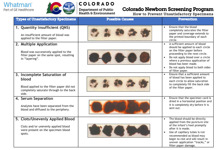 The following resources outline the newborn blood spot screen collection, demographic information, and unsatisfactory sample prevention.