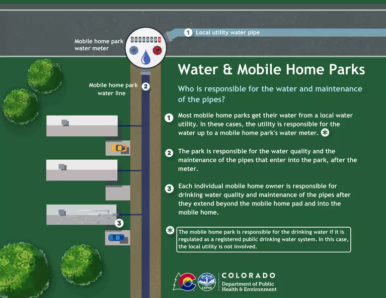The Mobile Home Park Water Quality Act helps Colorado protect clean and safe water in the state’s mobile home parks. The law created a drinking water testing program for Colorado's mobile home parks and requires the Colorado Department of Public Health and Environment to test the water in the parks, starting July 2024. The testing will determine if there are water quality issues at each park to help CDPHE create a plan for improving water quality. The law requires the division to develop and implement a statewide action plan by March 2026. The action plan will document our sampling findings, community outreach efforts, strategies identified for testing, and funding opportunities. CDPHE will conduct interviews with park residents about their water quality and translate materials into Spanish or any other identified language as necessary.